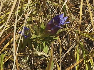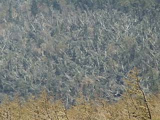 富士宮口5合目の西側の沢沿いは雪崩跡が草原になっています。森を出てたところで、草原の上方からカモシカが駆け降りてきました。そこで、目の前にいた私たちに気がついて固まっているところです。しばらくにらめっこしたあとで、こんどは反対側の沢に駆け降りていきました。宝永第一火口では落石が頻発していました。