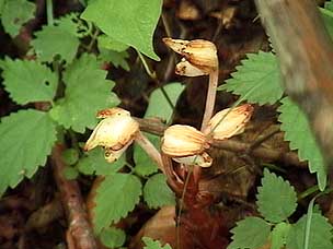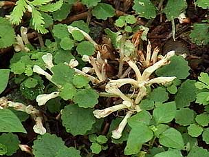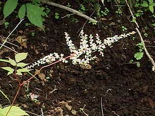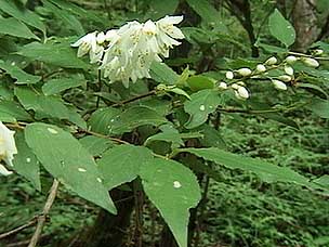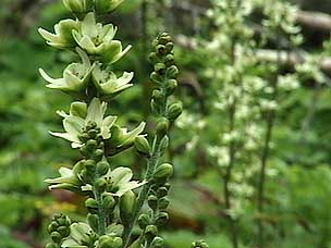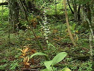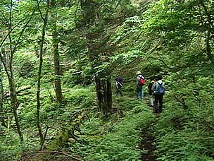 | 初めてのコースのうえ、風倒木のため通行不可の情報があったため引き返すことも考えに入れて出発しました。標高1,700mの富士宮口高鉢山駐車場から遊歩道に入るとすぐにオタカラコウの群落がありました。8月の花期にはチョウなどが集り、きっと賑やかになっていることでしょう。遊歩道は笹を刈るなどの手入れがされており、思いの外歩きやすく、自然林とウラジロモミの植林地の中を約4Km(標高差約500m)の道のりで西臼塚近くのキャンプ場まで続いています。お目当てのバイケイソウはすぐに見つかりましたが、今年は当たり年?のようで、その後大量に咲いているのが見られました。一昨年は花を探してもほとんど無く、西臼塚付近に数株見つけただけだったのが嘘のようです。コマドリ、ミソサザイ、アオ(アカ)ゲラなどの野鳥の声も多く聞かれました。(参加者5名) |
