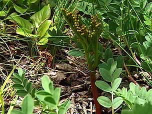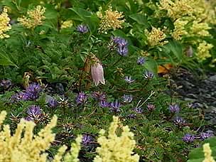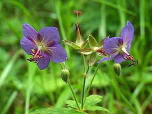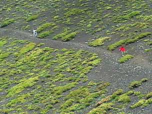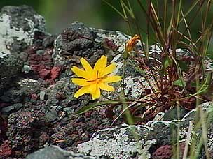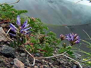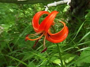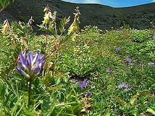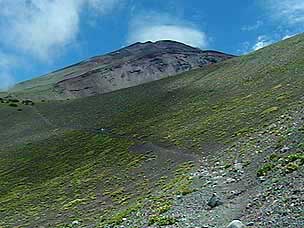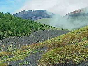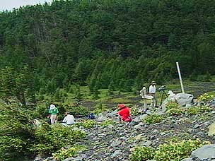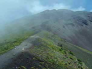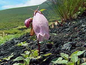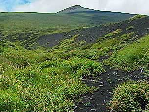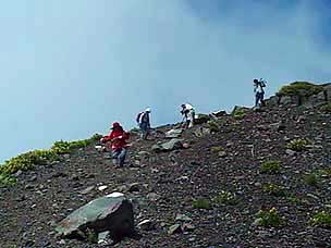 今回は富士山自然探訪、「自然散策・観察情報」で紹介しているコースです。7月下旬から8月上旬にかけては高地の草花が一斉に咲き競い、このコースでも毎年様々な草花が私たちを楽しませてくれます。5合目の駐車場は満車でしたが運良く空いて駐車することができました。宝永遊歩道に入ると、タカネグンナイフウロ、タカネバラ、クルマユリなどの花々が私たちを迎えてくれます。今回は植物に詳しい和田さんと磯田さんが加わり、現地で解説を聞きながらの楽しい散策になりました。宝永火口を横切り、第三火口下の御殿庭に下ります。荒原にはオンタデ、オノエイタドリ、ムラサキモメンヅルなどが咲いています。時折ガスが上がってきてはすぐに晴れるといった空模様です。小天狗塚での昼食は強い風とガスの中、小天狗塚を砂礫地まで下りるとまた穏やかな青空に、森を歩くうちに今度は雷と雨が・・・。運良く本格的に降る前に御殿場口にたどりつきました。(参加者8名) |