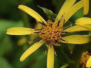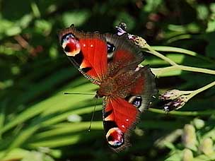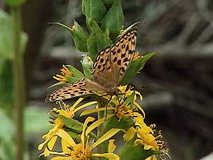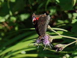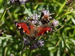 再び富士宮口5合目に出かけましたが、8月最後の日曜日で好天に恵まれたこともあって、先週と同様またしても駐車場は満車、そのため5合目より少し下った先週と同じ場所の散策になりました。幸いにも、先週見ることができなかったクジャクチョウが、今が盛りのヤハズヒゴタイやキオンなどの花々に吸蜜に集まり、間近でその美しい姿を見ることができました。また、先週1株だけ見つけたアオヤギソウが多数ありました。形はアオヤギソウなのですが須走口のものよりずっと小さく、タカネアオヤギソウのようです。その後、高鉢山付近のオタカラコウ群落地や水ヶ塚近くの夏緑樹林内にある巨木を訪ねながら遊歩道を散策、午後は麓(御殿場)の散策と須走口5合目のアオヤギソウを確認のため見に行きました。