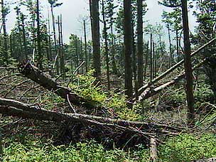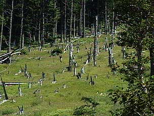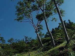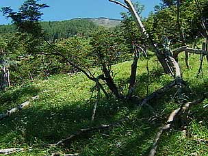 富士宮口・標高2,200m〜2,400m、沢沿いの草原(雪崩のため樹木が倒されている)