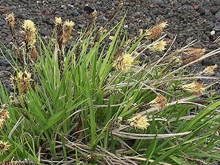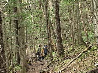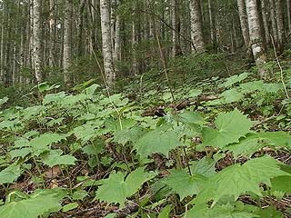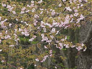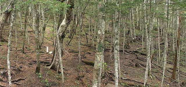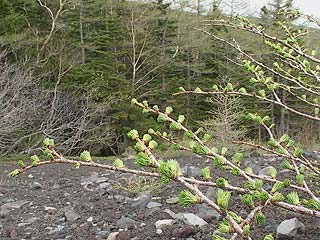 | 2002年5月12日の観察会は、須走口5合目から小富士を経由して旧馬返しに下りるというコースです。草花はまだこれからという時期ですが、カニコウモリ、マイヅルソウ、クルマバツクバネソウなどの若芽の中にタケシマランが小さな花を咲かせていました。小富士の砂礫地ではコタヌキランが咲き、オンタデ、イワオウギ、ムラサキモメンヅルなどのお馴染の草花が芽を出し、フジハタザオが一輪だけ咲いていました。ここはかつてオフロード車が進入して樹木を傷つけたり、砂礫地の植物を踏み荒らして問題になった場所です。森の中にはトウゴクミツバツツジ、オオカメノキなどの木の花や、ツバメオモト、イワセントウソウなどの草花が見られました。午後からは、西臼塚のイチリンソウを見に行きました。イチリンソウは前日の雨に打たれたため花びら(萼片)が痛んでしまっていました。(参加者6名) |