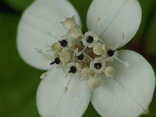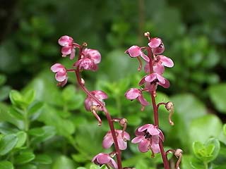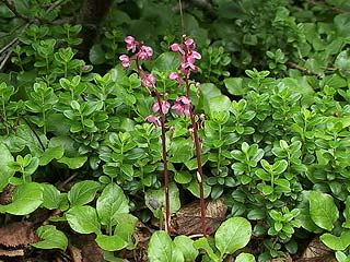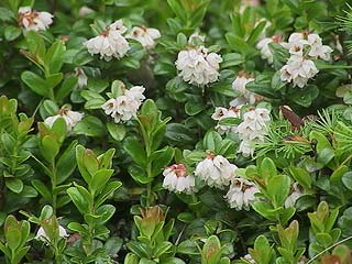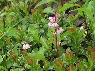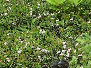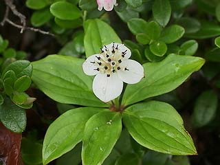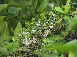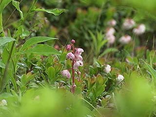 | 富士山NET「 富士山の植物 」の磯田さんに案内していただき、奥庭付近のお中道へのコースを散策しました。同所は昨年7月1日にも散策しましたが、今回は2週間遅かったため、ハクサンシャクナゲ、ゴゼンタチバナなどを見ることができました。台風7号の接近で富士山の中腹以上に笠雲がかかっていたため、霧と強風の中での散策になりました。目的の植物を見ることができたので早々に下界へ移動し、富士吉田口や近隣の草原を散策しました。初めての草花なども見られ、南麓との植生の違いをあらためて実感しました。午後はさわやかな青空の下での観察会でしたが、静岡側では雨が降っていました。(参加者8名) |