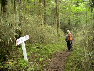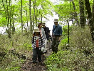 | 数日前、NHK静岡放送局で、小富士を走り回るオフロードバイクや、平安時代に開かれた村山口登山道の発掘調査などを紹介した1991年の番組が再放送されました。その放送から5年後の1996年、台風17号が富士山の南麓一帯に大規模な風倒木被害をもたらし、ほとんど消えていた登山道はさらに寸断されてしまいました。以来、村山口登山道は繁殖したスズタケと大量の風倒木に埋もれていましたが、その登山道を復活させようと活動を始めた畠堀操八氏(シニア大楽・山楽カレッジ)から登山道の復活状況をお知らせいただきましたので、早速、今回の観察会で登山道の一部を歩いてみました。散策したのは高鉢山〜ガラン沢・御殿庭コースの遊歩道途中からスカイラインまでの下り約600mほどの短い区間でしたが、2、3個所に風倒木があるものの比較的歩きやすく、今後、宝永遊歩道〜高鉢駐車場、またはスカイライン方面等の散策が楽しめそうです。草花の乏しい季節ながら、3年ぶりにコハクランを見られるなど、実りある観察会になりました。(参加者5名) |
