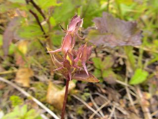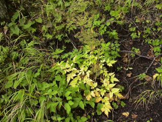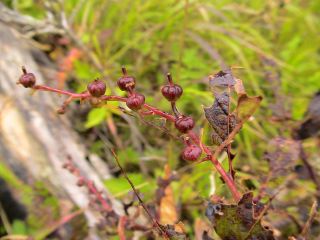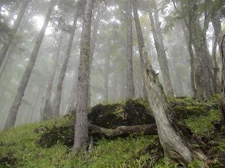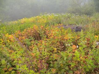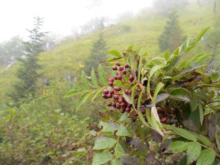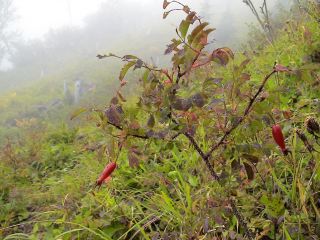 いつ降り出すか分からない空模様の中、予定通り富士宮口新五合目に向かいました。五合目西側の、雪崩で草原化した斜面では夏に花を咲かせていた植物が実をつけ、紅葉が始まりかけていました。草が濡れていたので早々に宝永遊歩道に移動、さすがに花は咲き残ったアキノキリンソウぐらいで、歩道脇のコケモモもほとんど実を採られてしまっていました。途中、宝永遊歩道と交差する村山口登山道(村山古道)を確認。宝永火口では霧のため火口の底がやっと見える程度でした。標高1,900m〜1,100mあたりでは秋の草花が多く見られましたが、雨が降り出したため早めの解散になりました。(参加者3名)