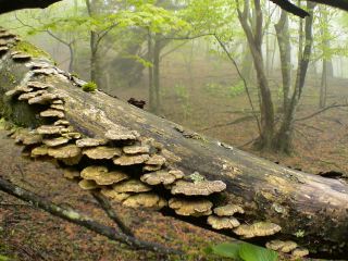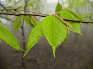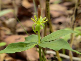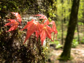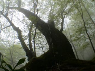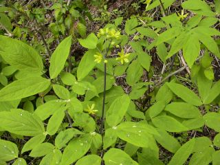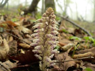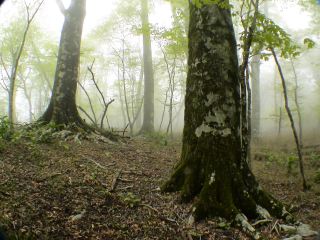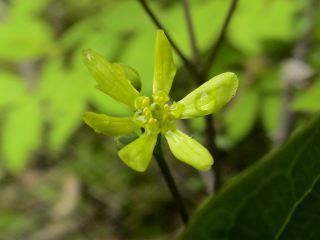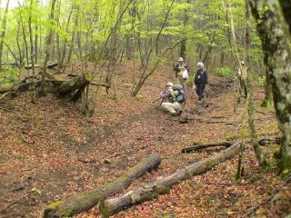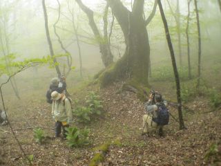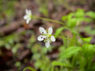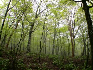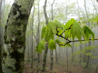 この数日低温が続き、昨夜は雨が降るなど天候が心配されましたが、幸い雨には降られず、霧がたちこめた新緑の森を楽しく散策することができました。春の草花は一段落し、ツルシロカネソウ、ワチガイソウ、ミツバコンロンソウ、ルイヨウボタンなどが見られました。ヤマシャクヤクは蕾が膨らんでいましたが咲くのはあと数日後でしょう。(参加者6名)
