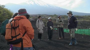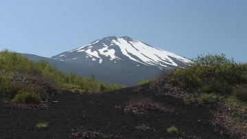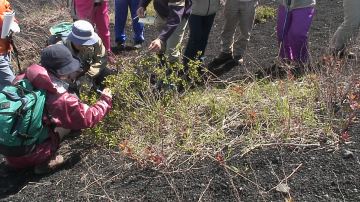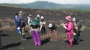 | 前日の御殿場市環境課主催観察会が雨でセミナーに変更されたのに続いてこの日も朝から霧雨、「青年の家で行ないます」との連絡がありました。午前10時からお昼までは青年の家の一室でプロジェクターを使って菅原先生のお話を聞き、少しづつ明るくなってきたため午後は霧雨の中を御殿場口新5合目に向かいました。すると途中から霧が晴れて残雪の富士山がくっきり。観察は砂礫地に単独で生育している植物から、小さな集団、大きな集団へと植物を記録していきました。この辺りでは宝永噴火から300年しか経ておらず、最後は先駆植物のカラマツ、ダケカンバなどの第一世代の樹木がまだ生育している森まで。遷移で行き着くブナ林はまたの機会にというところで自然教室は終了しました。森の中ではヤマシャクヤク、イワセントウソウ、マイヅルソウなどの草花や子育て中のアカゲラなども見られ、とても楽しい学びの一日でした。 |