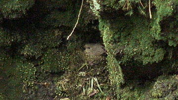 崖の中ほどの巣で抱卵する小鳥(中央)